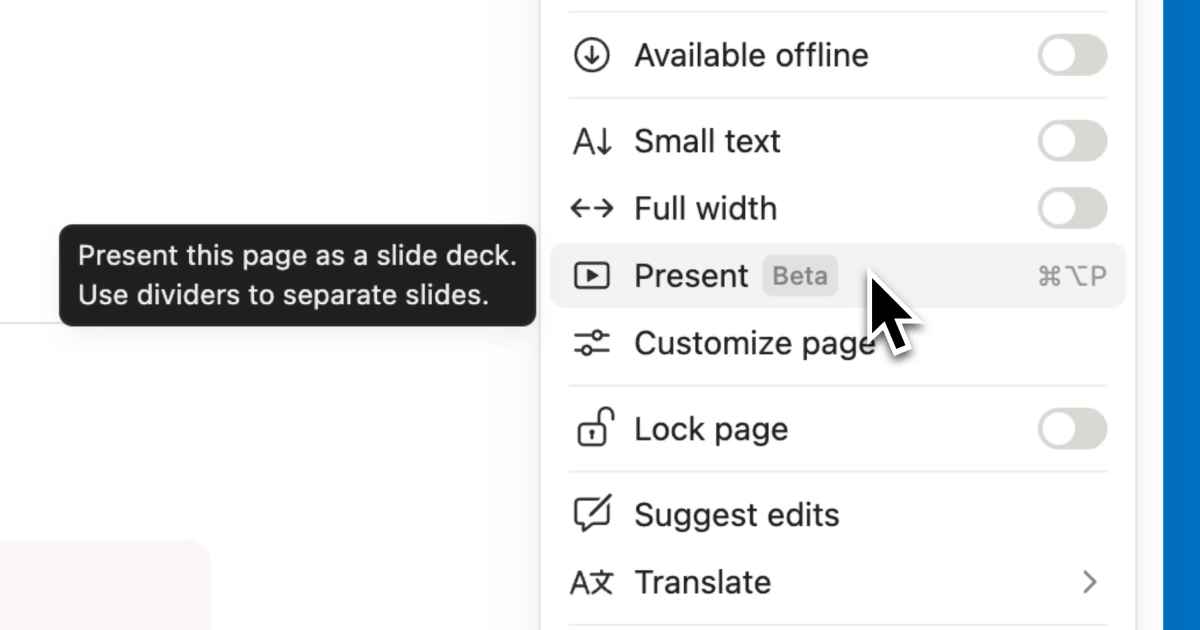 いま書いているページを、そのままスライドにできる。画像も、テーブルも、埋め込んだコンテンツも、全部そのまま映る。共有もNotionのページ共有と同じ仕組みなので、リンクを送るだけで相手にスライドが見える。