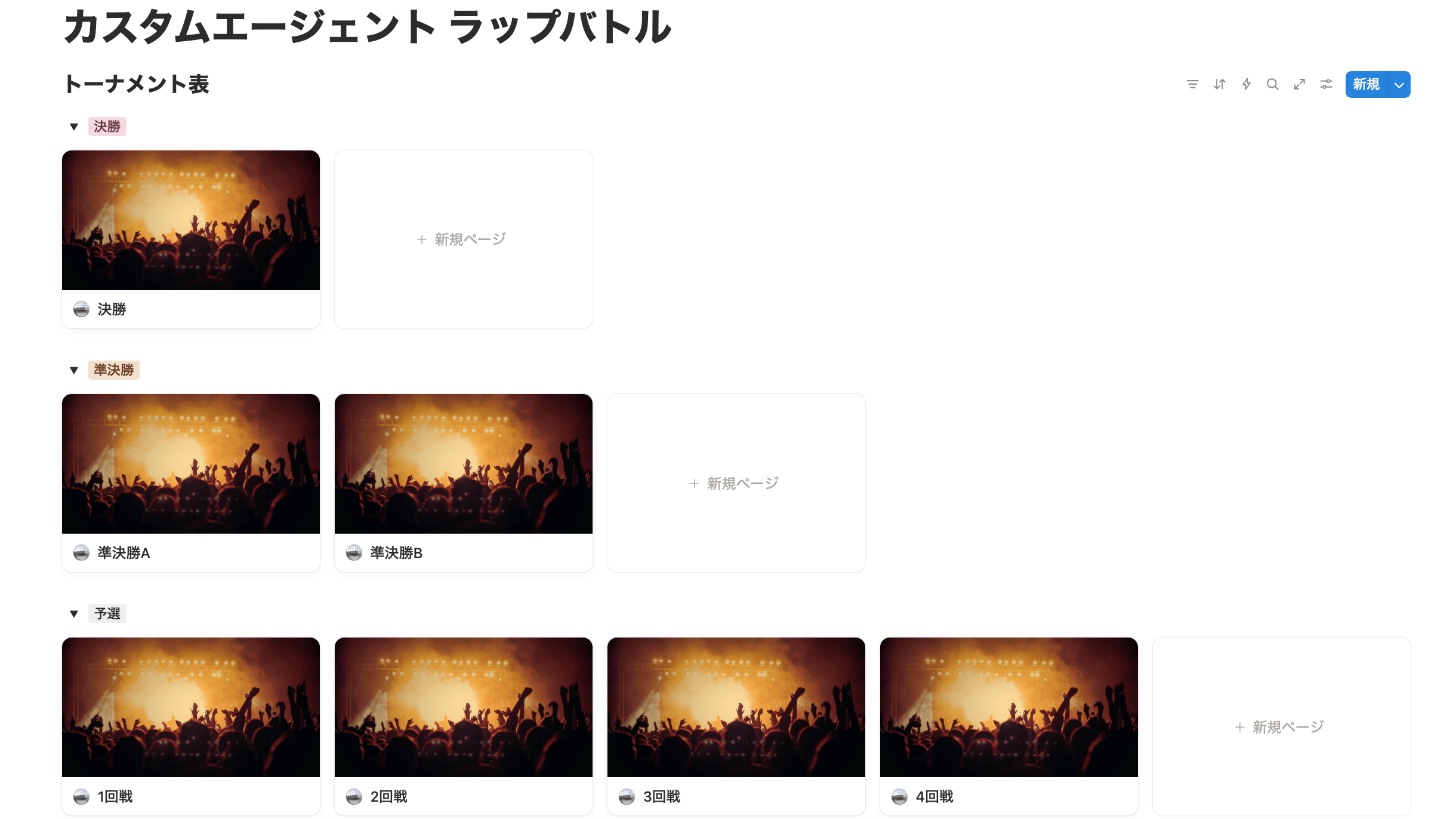 Notionのギャラリービューに「グループ」をかけると、予選・準決勝・決勝でカードが並ぶ。これがそのままトーナメント表になった。見た目はちゃんとしている。やっていることは馬鹿だが、Notionの機能としてはまともな使い方である。