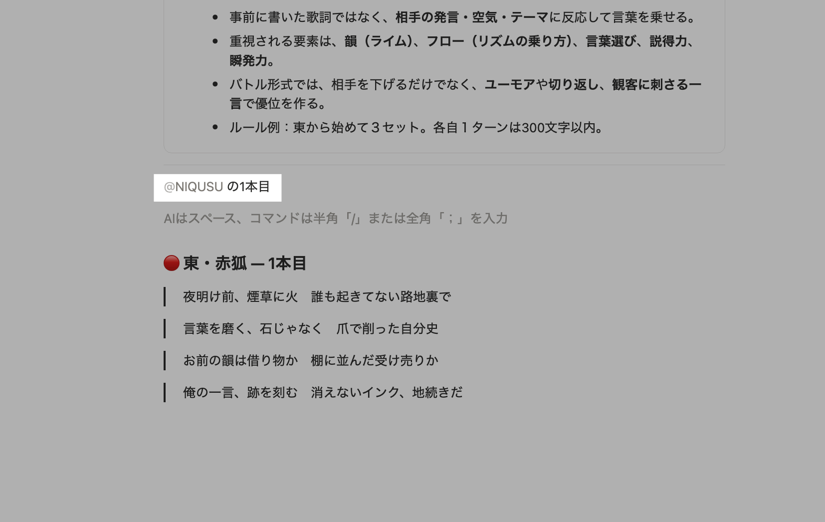 次にルール。「韻を踏む、相手の言葉を拾って切り返す、1ターン300文字以内」といった内容を書いて、ページテンプレートに仕込んだ。テンプレートに書いておけば、対戦カードを作るたびにルールが自動で入る。これでAIがルールを読んでバトルするはず、という設計だ。